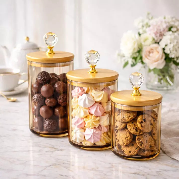 O Kit de Potes Herméticos de Vidro Cristal Luxo Âmbar é para quem busca conservação eficiente, beleza atemporal e organização premium.